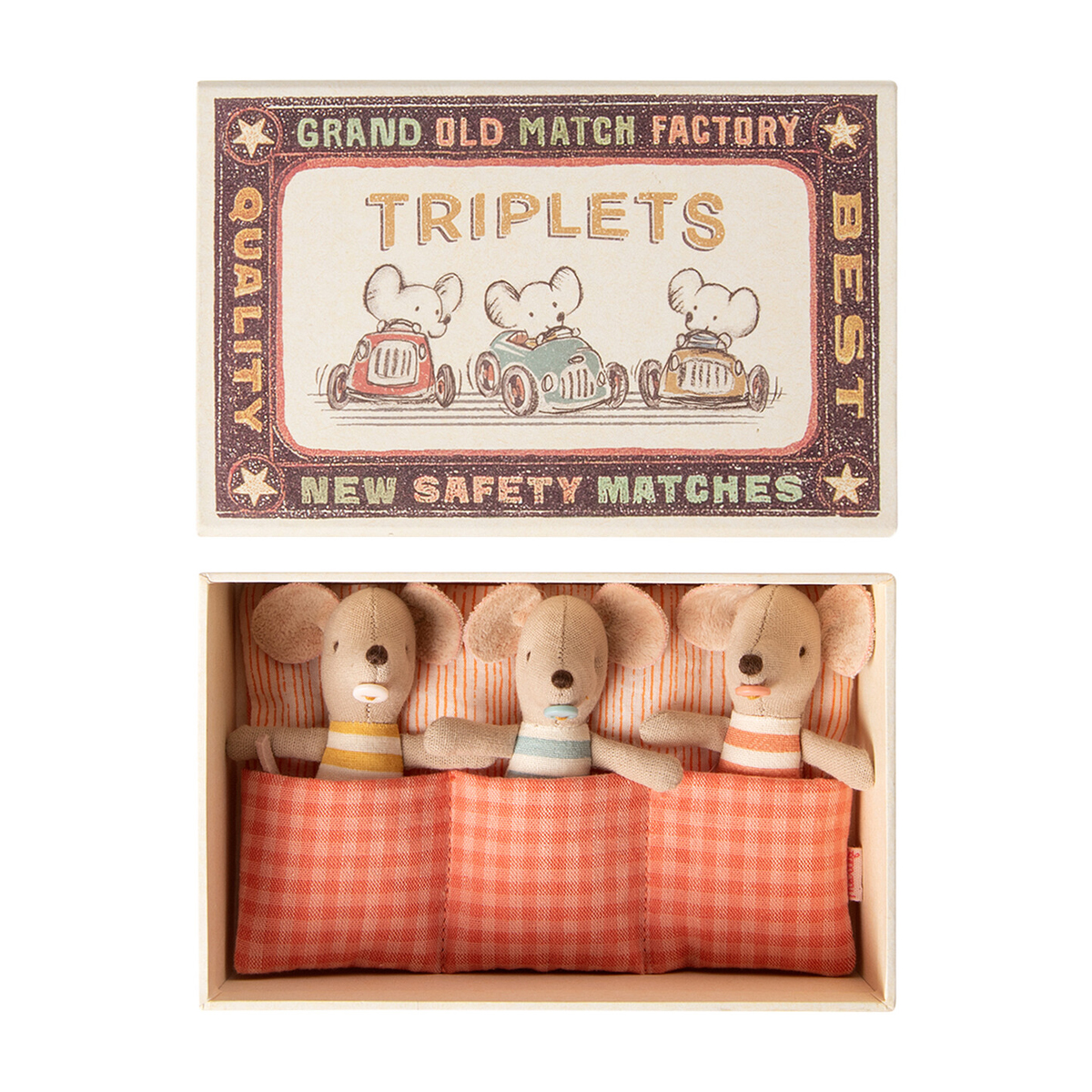 De 3 sødeste små trillinge-mus fra Maileg i tændstik-lignende æske, der også fungerer som seng, hvor de små mus kan puttes. Musene har hver sin farve stribet tøj på og sut i munden (kan ikke tages ud). Desuden medfølger madras, pude og tæppe, så mus (Læs mere)
