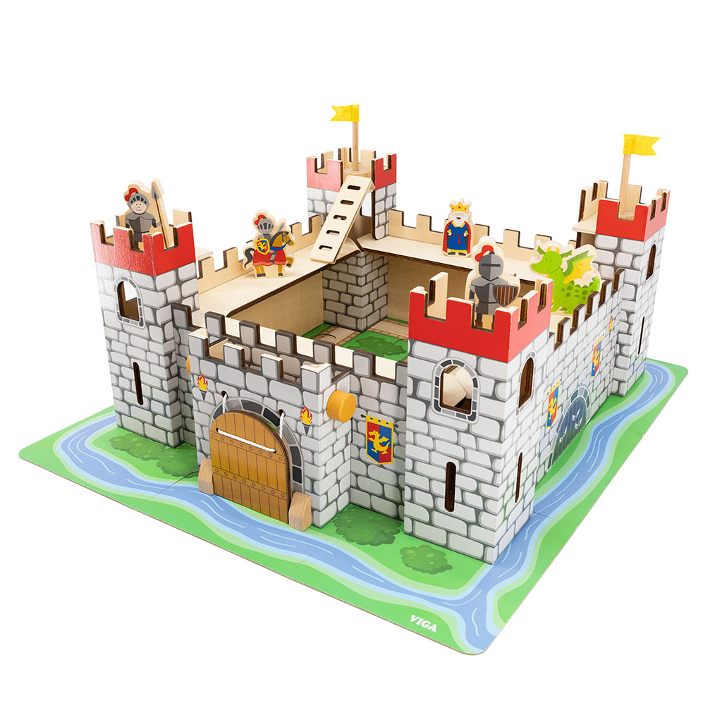 Velkommen til ridderborgen! Stor ridderborg i træ med 4 tårne og beboere, drage, trapper, hængebro og underlag. Alt hvad du har brug for til en sjov rollelege med riddere, konger og drager! Borgen måler 215 x 420 mm. (Læs mere)
